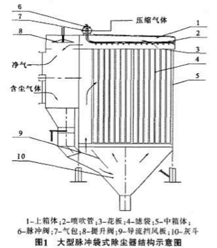 這種除塵器的工作原理工作時(shí),含塵氣體由除塵器進(jìn)氣總管通過(guò)進(jìn)氣支管的風(fēng)量調(diào)節(jié)閥,均勻地分布到各單元濾袋室,由于氣流斷面的實(shí)然擴(kuò)大或?qū)Я靼宓淖饔茫瑲饬髦幸徊糠执箢w粒粉塵因慣性而落入灰斗,顆粒小的粉塵通過(guò)篩分,慣性,粘附,擴(kuò)散和靜電等作用被作用被阻留在濾袋外側(cè),凈化信任感的氣體則進(jìn)入袋內(nèi),匯集到凈氣室,經(jīng)排氣管排出。隨著過(guò)濾的不斷進(jìn)行,由于粘附,截留等作用,塵粒在濾袋表面逐漸形成粉塵層。隨著濾袋表面粉塵的不斷增加,其濾袋阻力上升,當(dāng)濾袋室的壓差達(dá)到設(shè)定值或運(yùn)行到設(shè)定時(shí)間時(shí),控制儀發(fā)出信號(hào),提升閥關(guān)閉該單元濾袋室的排氣口,使該室處于離線狀態(tài)。這時(shí)壓縮空氣由氣包通過(guò)脈沖閥從噴吹管上噴嘴射入該單元濾袋室的濾袋內(nèi),進(jìn)行分組噴吹。噴吹結(jié)束后,提升閥打開(kāi),濾袋恢復(fù)過(guò)濾狀態(tài),同樣,其余各單元濾袋室由程序控制裝置控制依次進(jìn)行上述噴吹循環(huán),以實(shí)現(xiàn)清灰目的。然后,由濾袋膨脹和反向加速度作用而脫落于灰斗的粉塵經(jīng)輸灰裝置送走。
