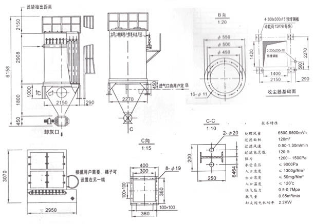 (3)3、設(shè)備外形及基礎(chǔ)見(jiàn)附圖,我公司還可根據(jù)用戶場(chǎng)地情況設(shè)計(jì)符合用戶要求的外形的除塵器。