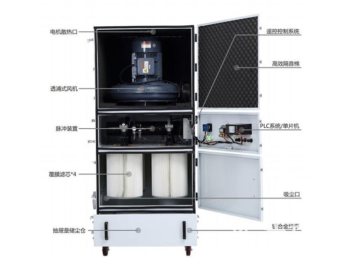 HD單機除塵器含塵氣體由除塵設(shè)備入口進入箱體,通過濾袋進行過濾,粉塵被留在濾袋內(nèi)表面,凈化后的氣體通過濾袋進入風機,由風機吸入直接排入室內(nèi)(亦可以接管排到室外).除塵器單機除塵器含塵氣體由除塵設(shè)備入口進入箱體,通過濾袋進行過濾,粉塵被留在濾袋內(nèi)表面,凈化后的氣體通過濾袋進入風機,由風機吸入直接排入室內(nèi)(亦可以接管排到室外).單機除塵器除塵布袋內(nèi)表面的粉塵抖落下來,采用自控清灰機構(gòu)進行定時搖振清灰或手控清灰機構(gòu),粉塵落到灰斗,抽屜或直接落到輸送皮帶上.